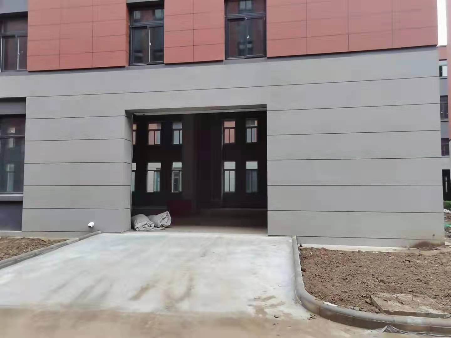 厂房结构形式为框架结构,外立面一改以往灰色为主的传统设计,采用色彩明快的红白灰三色相间仿石涂料。外观整体高贵、庄重的同时又体现了企业的科技感,同时仿石涂料耐污染强,不易褪色,可整体提升和保证入园企业形象。